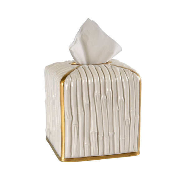 Transform unsightly tissue boxes with this elegant bamboo tissue box. Inspired by the sleek beauty of bamboo and fused with contemporary design. Crafted from fine porcelain in a white ethereal finish and accented with glistening 24 ct gold, this tissue box will add a subtle organic charm to your interior.