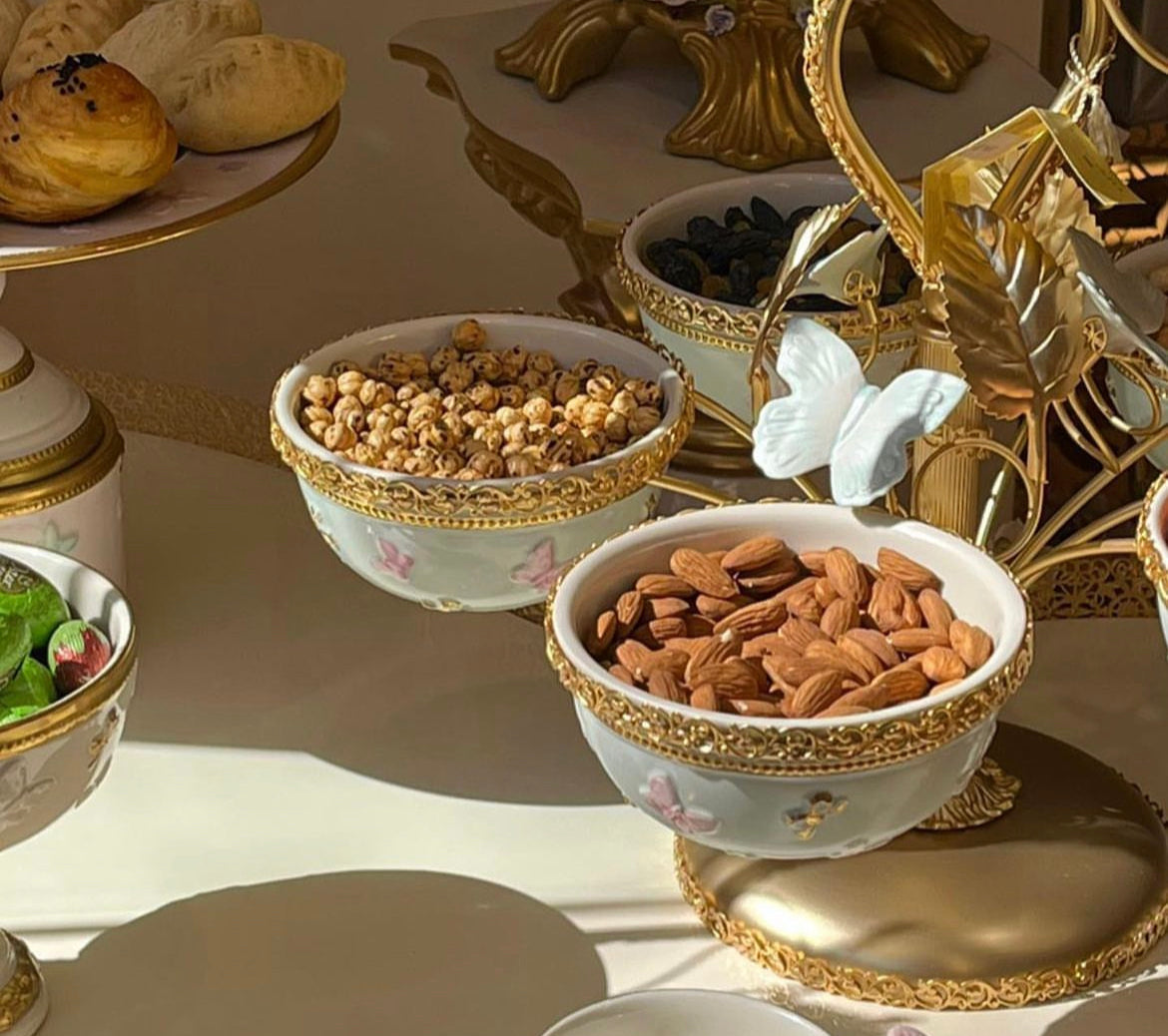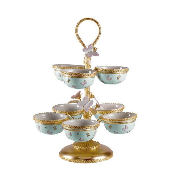 Showcase your treats and sweets with this stylish Pistachios Holder from Villari, inspired by the poetic dance of butterflies in spring. This serveware is crafted in Italy by skilled artisans in Italy from brass 24ct gold plated and Adorned with porcelain. This Pistachios Holder has 8 porcelain bowls with butterfly motif, hand-painted in a delicate pastel hue with a 24 ct gold rims. The bowls is perfect to present a selection of sweets, nuts, dates, chocolates and treats for an afternoon tea at home or to gift to a loved one for a special occasion.