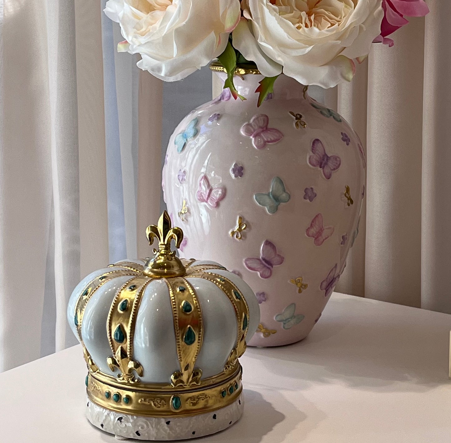 Antique gold finish with pastel blue details
