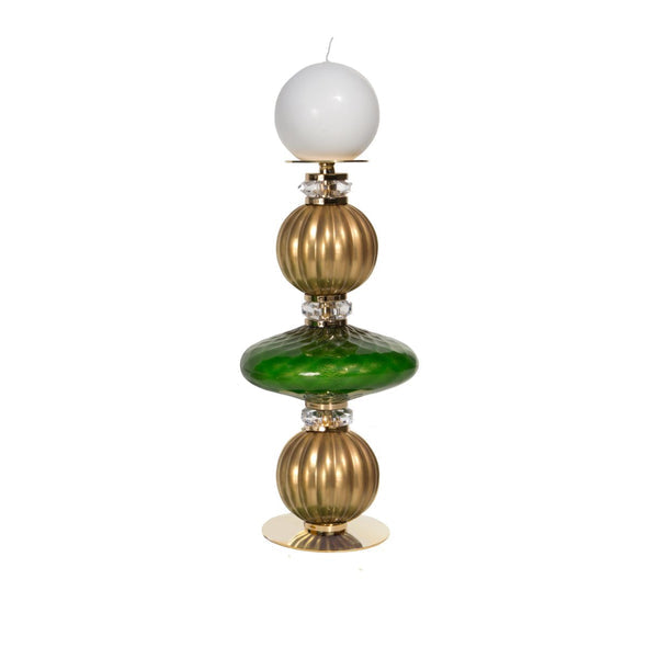 Boasting the presence of a diva comes this Diva Greta candle holder from Villari.The Divas Collection pays homage to the Hollywood stars of the '40s and this superb candle holder is dedicated to the unique personality of Greta Garbo. It is a feminine and sophisticated piece, creating an eye-catching effect in both a classic and contemporary interior. Hand crafted from 24 ct gold plated brass and porcelain, this stunning sculptural piece is comprised of two grooved bauble style features painted in 24 ct gold, with a striking green embossed pebble shaped feature in the centre, embellished with a subtle gold pattern, interspersed with crystal ring accents. All eyes will be on this glamorous beauty wherever you place it in the home.