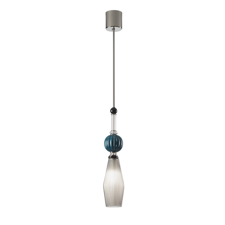 This string pendant lamp is part of the Divas Collection, paying homage to the Hollywood stars of the '40s. Sophistication and character combine in this superb masterpiece dedicated to the unique personality of Lola Todd.This exquisite pendant lamp showcases a rich and precious silhouette. The metal frame comes straight down from the ceiling from a cylindrical element to end in an eye-catching composition. The grooved glass diffuser slightly tapers downwards and hosts a single lightbulb, while the spherical element placed on top of it shares with it the same texture painted in a vivid hue of azure blue. The height of this pendant lamp is 120 cm and is adjustable on special request.