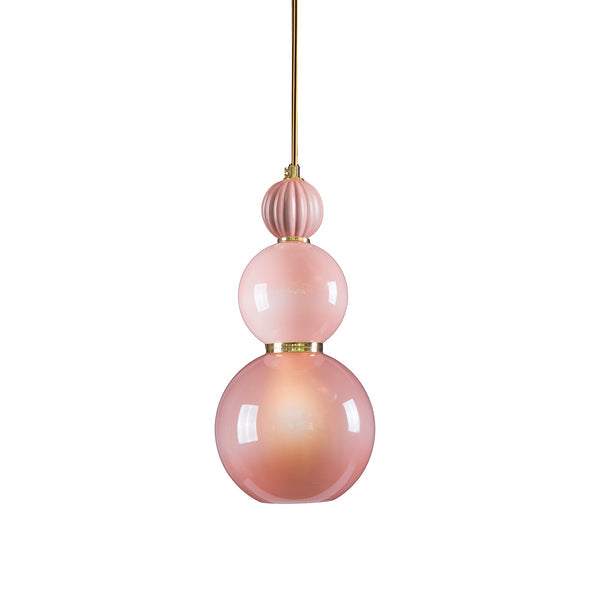 Give your home a glamourous touch with this Lady V Pendant Light, inspired by classic Hollywodian glamour. LADY V is imaginary mane representing some of the last century most famous women, known for their unmistakable charms. The structure in brass supports two splendid Murano glass spheres in pink and blush color hue and one sphere in porcelain hand painted in a deliacte pink. The Lady pendant light is a tribute to femininity and now an icon of Villari production. It is a jewel to be admired day and night and can be teamed with matching accessories from the Lady V collection to complement the look.
