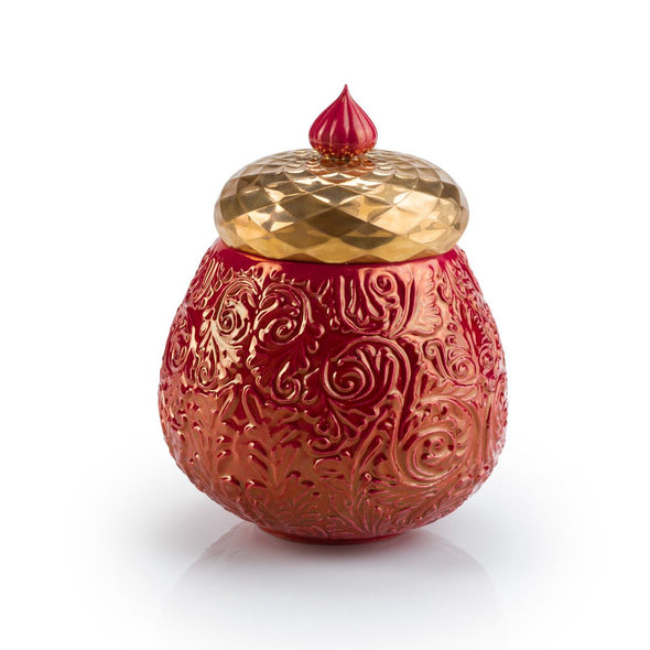 Create a warming glow with this Lolita scented candle from Villari inspired by the extravagant outfits of Lolita. The scented candle is encased in a sophisticated fine porcelain vessel hand crafted in Italy. The glossy surface features an elegantly textured high-relief motif inspired by traditional macramé lace embroidery used in ceremony dresses, hand painted in a radiant ruby hue contrasting with its shinny gold cover. It will add an aura of sophistication to your interior. The fragrance and the wax are made in France with 100% pure Vegetable Wax (eco-friendly) for about 35 hour burning time. The Passion Eternelle Fragrance will fill your home with essences of : Patchouli, Amber and Vanilla.