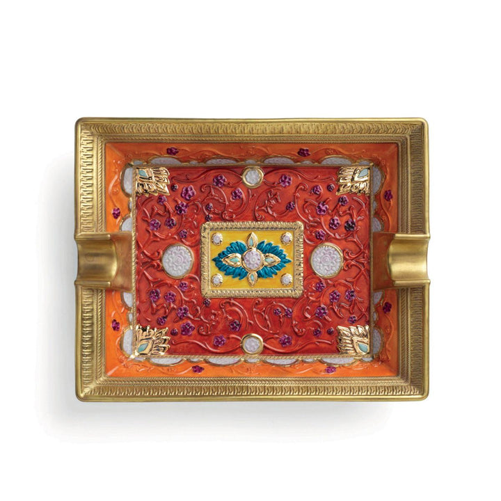 Lend elegance to any surface in your home with this Oriental asthtray from Villari. Inpired by the symbols and motifs of Oriental rugs, this ashtray has been crafted by skilled artisans in Italy from porcelain and hand painted with wonderful colors and with 24ct gold details. The green color symbolizes the spirituality and the blue color is an emblem of strength. This is a tribute to rug design techniques that were made thousands of years ago have been handed down from one generation to the next. Sure to be admired by guests to your home it is the perfect smoking accessory to enjoy a cigar or store trinkets, making this ashtray a wonderful gift idea for any special occasion.