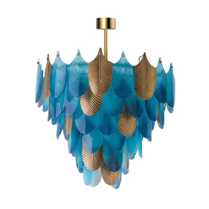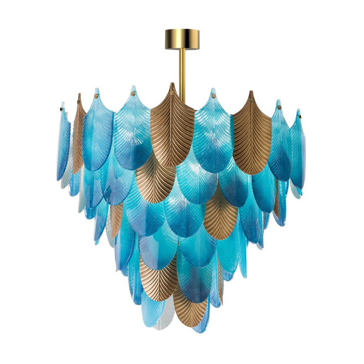 Make a grand statement in the home with this wonderful chandelier inspired by Art Deco and peacock plumage. The structure is made of brass, supporting rows of feather-shaped shades in gold-finished porcelain, and mouth-blown Murano glass in shades of gold and light blue, shielding the light from the 12 bulbs for a stunning final effect. This work of art exudes mesmerizing allure and is a splendid example of Villari’s exquisite craftsmanship. A magnificent chandelier that will add sophistication and drama to a refined home.