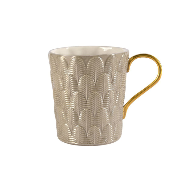 Enjoy a warm beverage in luxurious style with this Peacock mug from Villari. The grace of the majestic peacock, inspired by shapes from twenties deco style, re-interpreted and added with an eclectic twist, the result is a beautiful peacock feather like high relief pattern, creating a luxurious ambience. Crafted from fine porcelain in Italy and hand painted in a striking caramel color with 24ct gold detailing, this mug is an ideal gift idea for a special occasion, or a stunning decorative addition to your home and can be paired with complementing tableware to complete the look.
