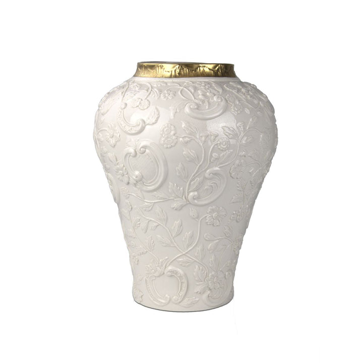 Inspired by the fashionable resort of Taormina on the east coast of Sicily, featuring textured botanical motifs, this Taormina Large Cachepot will add a dash of sophistication to your interior. Crafted from porcelain, in a crisp white hue and 24 ct gold accents, this Taormina vase has a height of 36 cm and can be coordinated with additional pieces from the Taormina collection to complement the look.