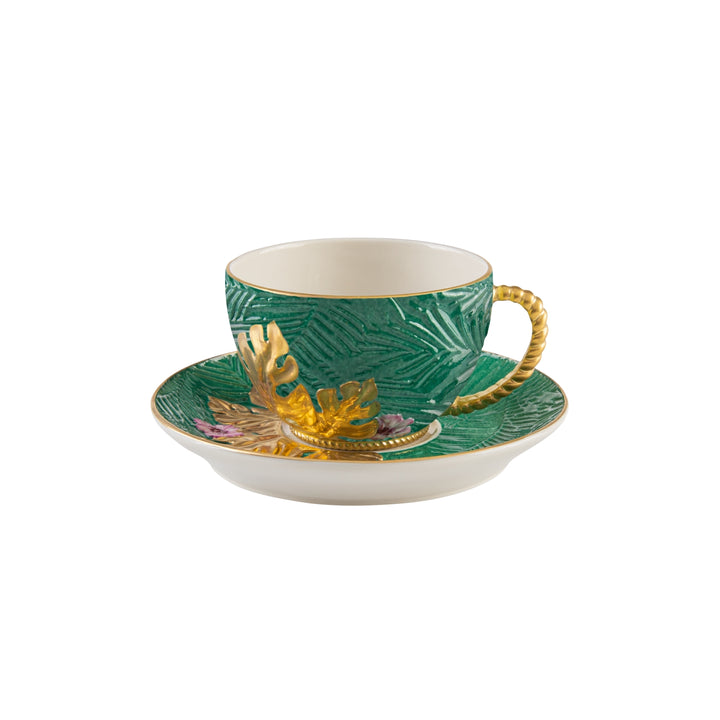 A tribute to the flourishing tropical nature of this well-known Mexican location, the ACAPULCO collection sets the table with teapots, dallahs, large and smaller cups, plates, saucers and dessert stands full of exotic charm. Made in porcelain painted by hand in an intense emerald green hue with details in 24 carat gold, the tea set display naturalistic relief motifs that reference banana leaves and flowers, enhancing all the products. With its bright colors and impeccably detailed botanical patterns, Acapulco has been created to amaze guests with its captivating design.