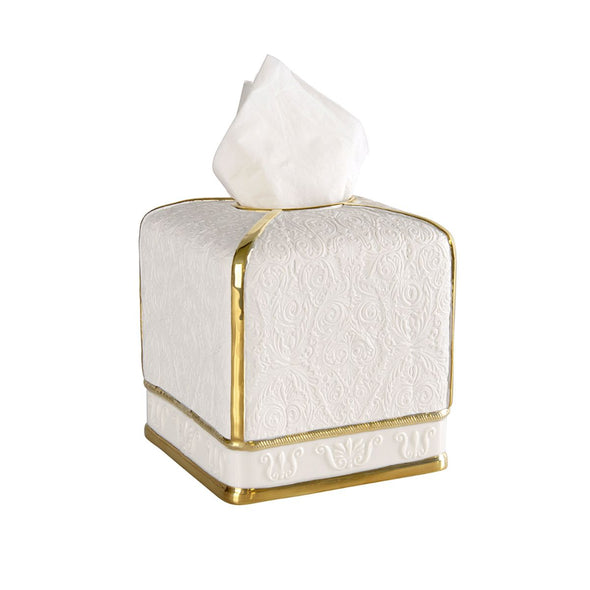 Disguise unsightly tissue boxes with this fabulously chic Secret Amour tissue box. Crafted from the finest porcelain, and adorned with a raised, textured motif inspired by traditional macrame lace embroidery used in ceremonial dresses, in a matt white finish with 24 ct gold accents. Team with matching accessories to stylishly coordinate the look.