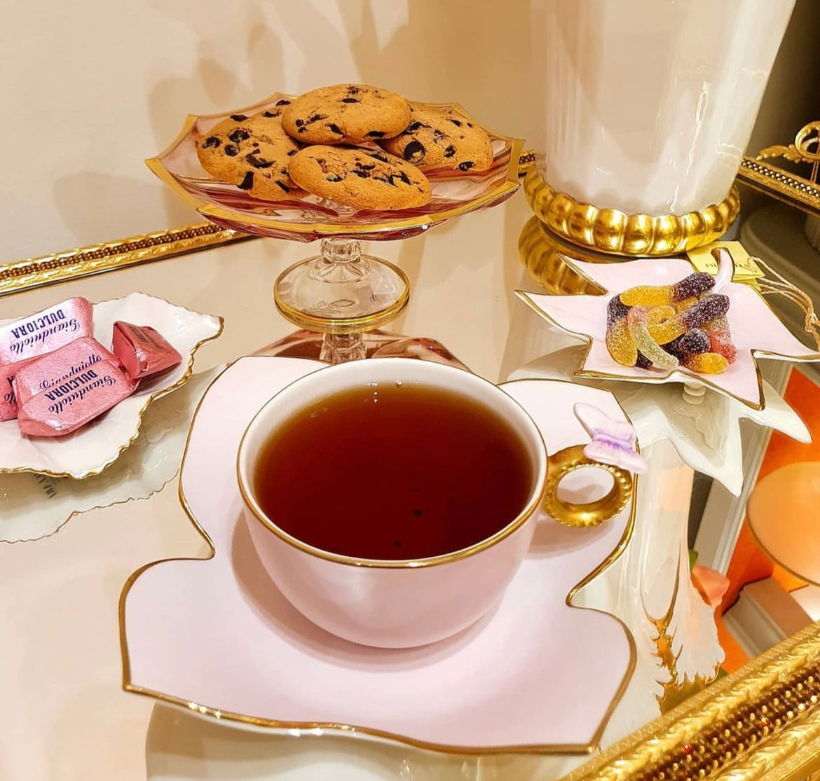 Host a dreamy afternoon tea with this Butterfly coffee cup. Crafted from fine porcelain, this coffee cup is adorned with delicate butterflies and flowers, inspired by the poetic dance of butterflies in spring during the peach blossom season. Hand painted in a delicate pastel hue and finished with a striking 24ct gold handle, this coffee cup will add an air of sophistication and elegance to any setting. Pair it with coordinating tableware from Villari’s Blooming Butterfly collection to complete the look.