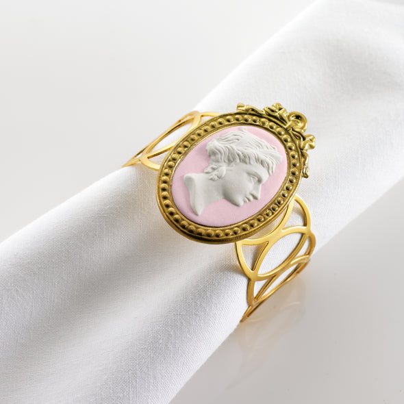 Add the finishing touch to your tablescape with these charming Era napkin rings. Hand crafted from fine porcelain in Italy in a matt white and pink finish, atop a 24 ct gold plated brass ornate ring holder.