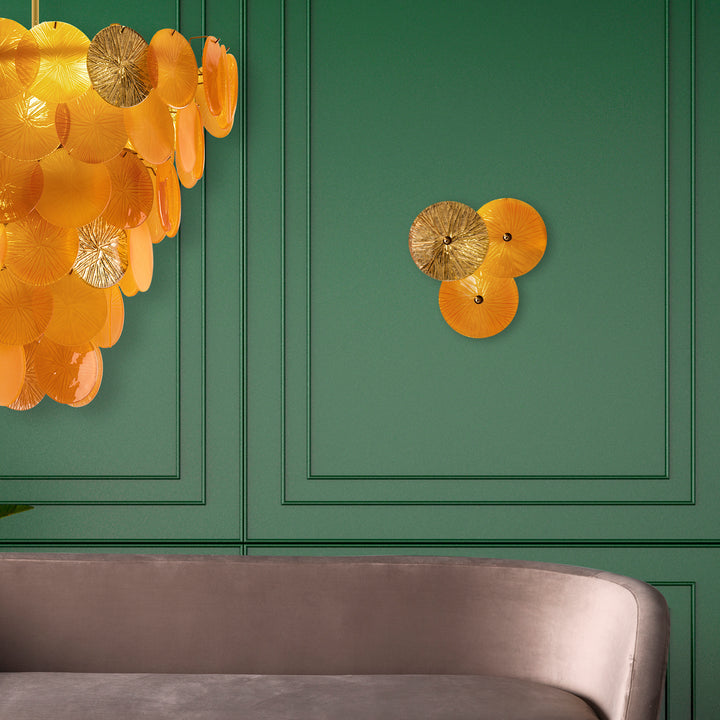 Light up your walls in style with this Candy Wall Light. The structure in brass supports three elements evoking old fashioned candy design made of mouth-blown Murano glass in a striking mango color and 24ct gold hand painted porcelain. Two light bulbs underneath shine brightly to create a sublime ambient light. The geometric design is playful and eye-catching . This Candy wall light will add a sweet touch to your interior and will illuminate your home in style.