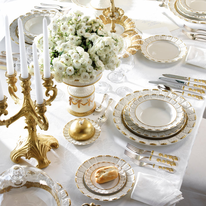 Bring some majesty to your table setting with this Queen Elizabeth dinner set from Villari. Crafted from the finest porcelain, this dinner set has a raised feather motif hand painted in pastel pink with 24ct gold details. This set is the perfect complement to an elegant, sophisticated and looks fabulous paired with coordinating afternoon tea available separately from Villari’s Queen Elizabeth collection.