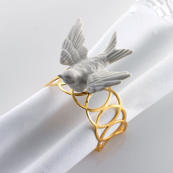 Doll up your dining table with this fabulous ethereal dove napkin ring from Villari. Hand crafted from the finest porcelain in Italy in a matt white finish with a 24 ct gold plated brass circular design holder, it will add a chic finishing touch to your table setting.