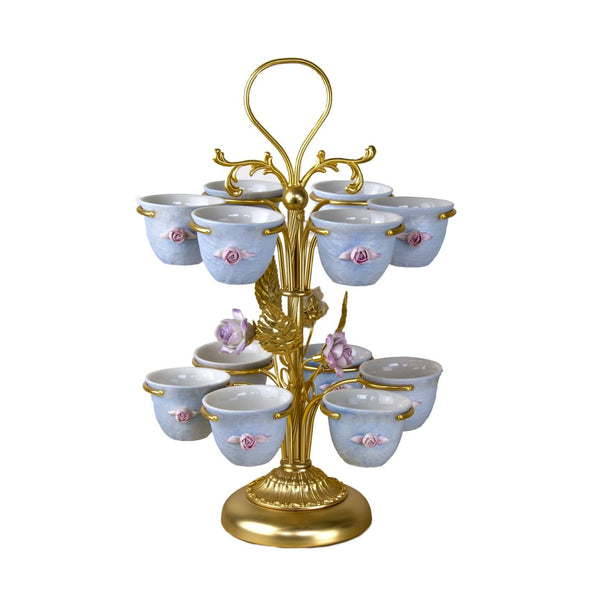 Make a spectacular statement with this Marie-Anoinette elegant Arabic coffee cup holder. This collection is inspired by Marie-Antoinette, Queen of France and Spouse of King Louis XVI of France. The Queen had great charisma and an extravagant personality and is known for her spending habits, her taste for everything over the top and her passion for roses and afternoon Tea. The 12 coffee cups are hand crafted from procelain and hand decorated in a delicate pastel blue hue. The holder is crafted in brass 24 gold plated and adorned with handmade porcelain roses. It makes a decadent piece for completing your table. It is the perfect complement to a sophisticated afternoon tea and looks fabulous paired with the matching accessories from the Villari’s Marie-Antoinette collection.