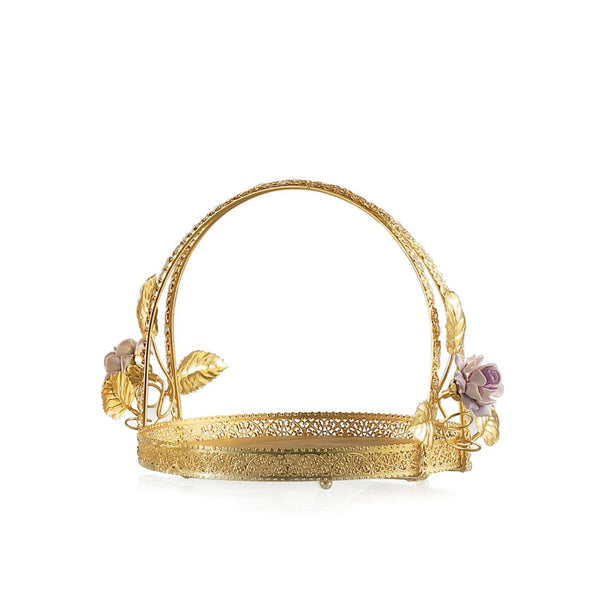Serve guests in ultimate luxury with this Bonbon Basket crafted by skilled artisans in Italy from brass 24ct gold plated and adorned with romantic handmade porcelain roses. Each flower is made by hand in porcelain and hand-painted in pastel pink. This collection is inspired by Marie-Antoinette, Queen of France and Spouse of King Louis XVI of France. The Queen had great charisma and an extravagant personality and is known for her spending habits, her taste for everything over the top and her passion for roses and afternoon Tea. Intricately designed with laced brass 24 gold plated, it makes a decadent piece for completing your table. Villari has unusual decorative accessories to embellish your table and to make your party unforgettable. This bonbon basket is certain to wow guests.
