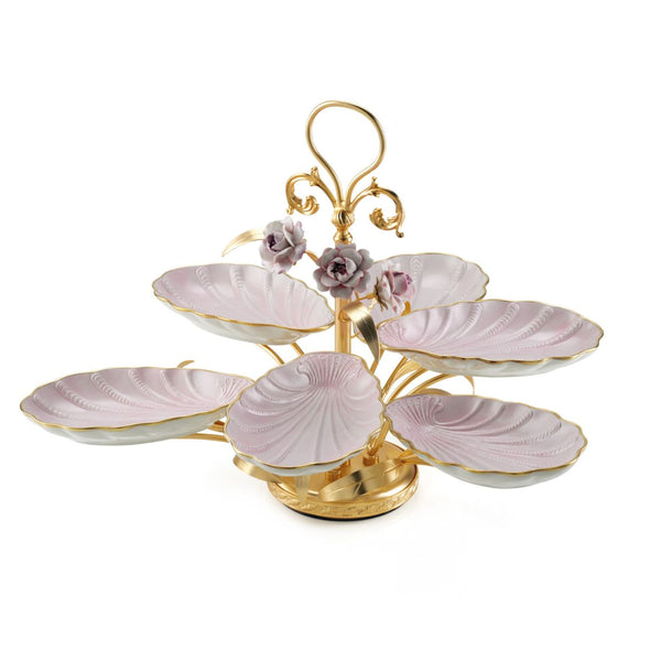 Showcase your treats and sweets with this stylish Eleonora Cookie Stand from Villari. This Stand is crafted by skilled artisans in Italy from brass 24ct gold plated and Adorned with romantic camelia flowers. Each flower is made by hand in porcelain and hand-painted in pastel pink. This Eleonora Cookie Stand has 6 porcelain trays hand-painted in pastel pink with a 24 ct gold rims. The trays provide ample room to present a selection of sandwiches, sweets, nuts, dates, chocolates and treats for an afternoon tea at home or to gift to a loved one for a special occasion.