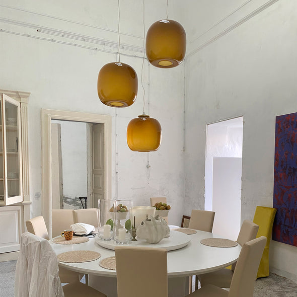 Nardò Pendant Light is amazing pendant structure made up of 1 easily adjustable pendant suspension supported by steel cables.The pendant is made of Murano glass blown by master craftsmen, with porcelain ellipse decorated in platinum. The whole of this chandelier brings us back to the atmospheres of Salento precisely for this reason its name recalls Nardò the famous city of the Salentina peninsula which represents its colors and magical atmosphere. This chandelier is inspired by this unique atmosphere.