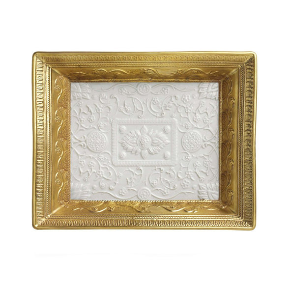 Lend elegance to any surface in your home with this Oriental vide-poche from Villari. Inpired by the symbols and motifs of Oriental rugs, this vide-poche has been crafted by skilled artisans in Italy from porcelain and hand painted with 24ct gold details.This is a tribute to rug design techniques that were made thousands of years ago have been handed down from one generation to the next. Sure to be admired by guests to your home it is the perfect way to store trinkets, jewellery and other small accessories, making this vide poche tray a wonderful gift idea for any special occasion.