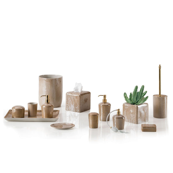 Give your bathroom shelf the five star treatment with the Portofino collection. Crafted by skilled artisans in Italy from porcelain, adorned with a reptile skin like pattern and hand painted in a satiny caramel hue, this bathroom set will add elegance to your interior.