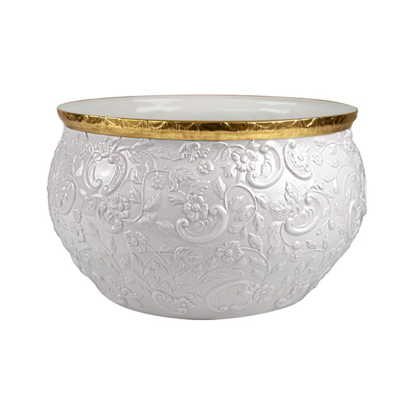 Inspired by the fashionable resort of Taormina on the east coast of Sicily, featuring textured botanical motifs, this Taormina Large Cachepot will add a dash of sophistication to your interior. Crafted from porcelain, in a crisp white hue and 24 ct gold accents, this Taormina cachepot has diameter of 50 cm and can be coordinated with additional pieces from the Taormina collection to complement the look.