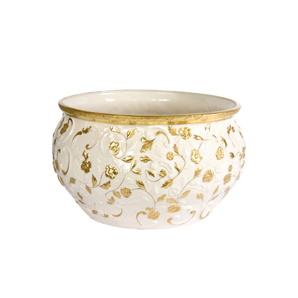 Inspired by the fashionable resort of Taormina on the east coast of Sicily, featuring textured botanical motifs, this Taormina Small Cachepot will add a dash of sophistication to your interior. Crafted from porcelain, in a crisp white hue and 24 ct gold accents, this Taormina cachepot has diameter of 29 cm and can be coordinated with additional pieces from the Taormina collection to complement the look.