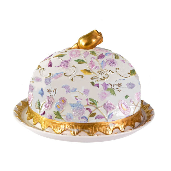 Serve your guests with this Taormina tray dome covered from Villari adorned with a raised textured botanical motif inspired by the exclusive and fashionable resort of Taormina, on the east coast of Sicily. Skilfully crafted from porcelain, some details of this piece have been delicately hand painted in a pretty multi-hued color palette and 24ct gold. It’s fabulous for serving treats to your guest and can be paired it with matching accessories, available in the Taormina collection to coordinate the look.