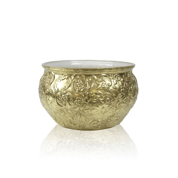 Inspired by the fashionable resort of Taormina on the east coast of Sicily, featuring textured botanical motifs, this Taormina Small Cachepot will add a dash of sophistication to your interior. Crafted from porcelain, in a crisp white hue and 24 ct gold accents, this Taormina cachepot has diameter of 29 cm and can be coordinated with additional pieces from the Taormina collection to complement the look.