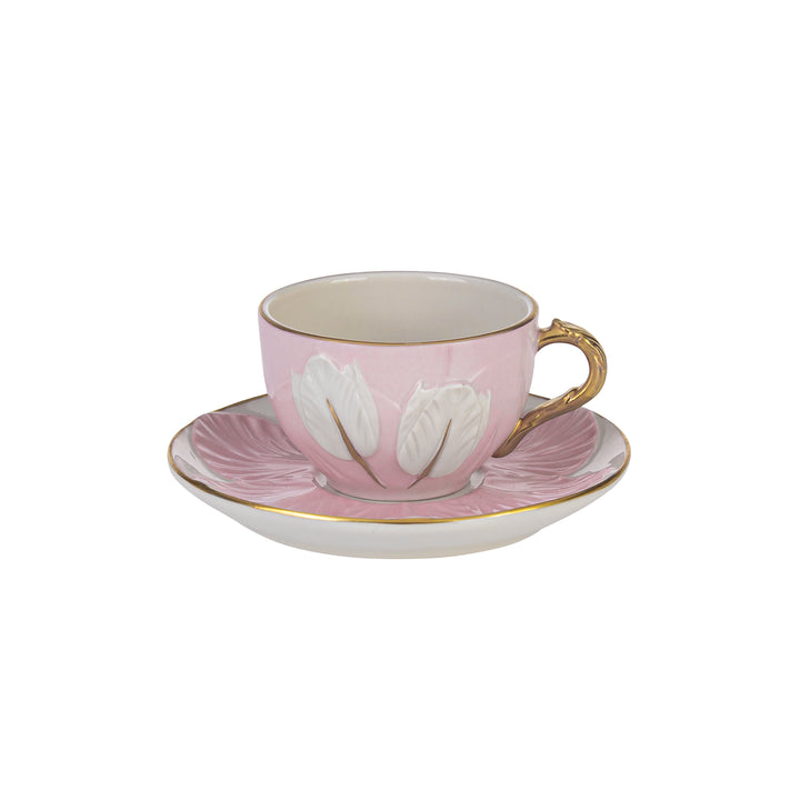 Host a dreamy afternoon tea with this Tulip coffeecup. Crafted from fine porcelain, this coffeecup is adorned with delicate tulips flowers,With the TULIP collection, Villari brings spring right in to your home. The entire collection is Art Deco inspired and characterized by a refined Tulip in relief, the flower that most of all signifies the arrival of the good season. Hand painted with 24ct gold details, this coffeecup will add an air of sophistication and elegance to any setting. Complete the look by pairing this coffe cup with complementing tableware from Villari’s Tulip collection.