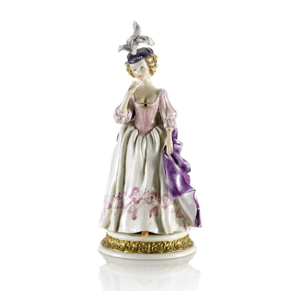 Add a Venetian flair to your home. The Venice Carnival is the most famous and sophisticated carnival in the world with colorful costumes and masks. Villari has carefully captured in porcelain the most important characters of the the Italian commedia dell'arte such as Harlequin, Colombina, Pantalone, Pierrot, Scaramouche… This Isabella mask reflects the splendor of the Venice Carnival. Isabella is certainly the most known character among all female Lovers. Elegantly dressed, Isabella has been faithfully shaped and decorated in Italy by skilled master craftsmen. Presented in a yellow Villari gift box this figurine will make a timeless gift idea and will look stunning in a display cabinet paired with other figurines of the commedia dell'arte to complete the collection.