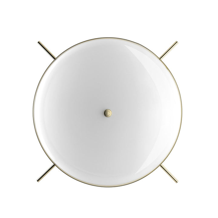 This stunning Venusia celling light reinterprets Art Deco glamour in a modern and dramatic way. Venusia takes this name from a series of cartoons very popular in the 80s, as with its design is inspired by a UFO but at the same time recalls in the features geometries that bring us back to the Deco design Districts of Miami developed between 1920/30 Its structure in brass serves as mounting for the mouth-blown Murano glass shade and is embellished by four brass spikes that give the silhouette a dynamic flair.